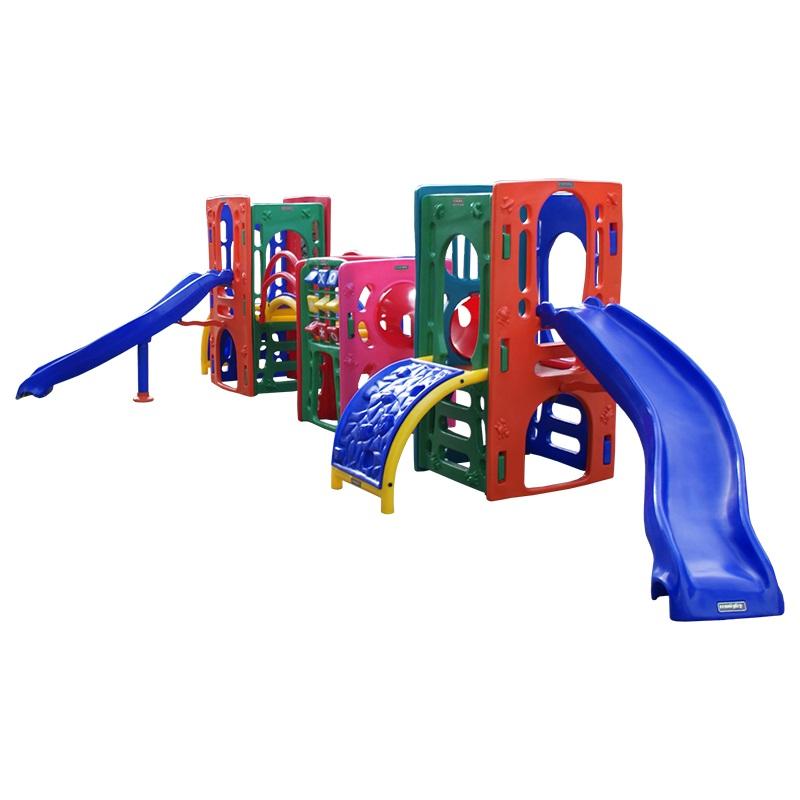 Playground formado por três torres montadas em linha, interligadas uma parte por uma passarela com corrimão e outra parte por túnel. Contém uma rampa pequena, duas rampas grande curva, duas escaladas pequenas em formato de montanha, um jogo didático na torre central, pisos e degrau de acesso ao túnel Seguro proporciona momentos divertidos e de descontração para a garotada. Certificado de acordo com a norma NBR 16.071. Idade Sugerida: a partir dos 3 anos acompanhado de um adulto, até 12 anos. Da base até o chão 67 cm. Alt: 1.70 m Comp: 6.70 m Larg: 3.60 m