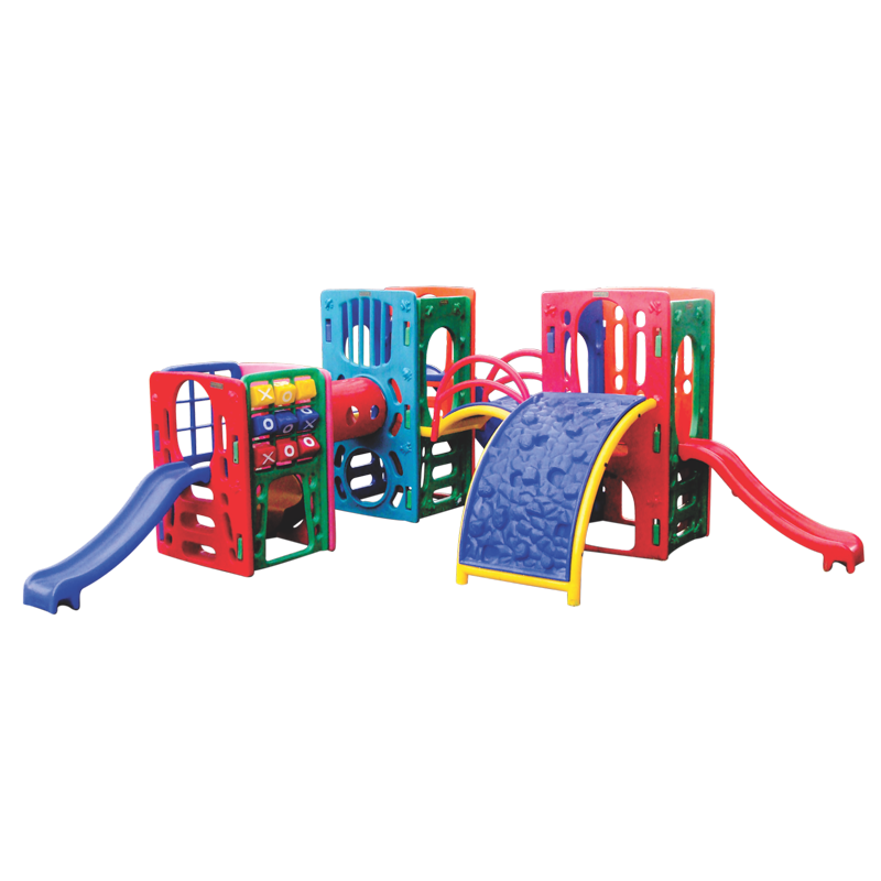 Playground formado por três torres montadas em linha, interligadas uma parte por uma passarela com corrimão e outra parte por túnel. Contém duas rampas pequenas, uma rampa grande, uma escalada grande em formato de montanha, um jogo didático na torre central, pisos e degrau de acesso ao túnel. Seguro proporciona momentos divertidos e de descontração para a garotada.